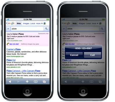 Los anuncios de creatividad de llamada se muestran en Google.com en los dispositivos de gama alta con navegadores de Internet completos. Para aprovechar esta función, los anunciantes deben habilitar las extensiones de teléfono y activar la casilla "Formato de llamada telefónica" en la pestaña "Extensiones de teléfono" en su campaña para móviles. Los anuncios de creatividad de llamada pueden obtener clics de dispositivos como el iPad o el iPod Touch, que no pueden realizar llamadas. Los clics en los anuncios que se hagan desde estos dispositivos enviarán a los usuarios a la página de destino del anunciante. Al igual que sucede con todos los formatos de anuncio de clic de llamada, a los anunciantes se les cobra cuando el usuario hace clic en el número de teléfono que aparece en el anuncio. Para obtener instrucciones sobre cómo habilitar las extensiones de teléfono en tu campaña para móviles, haz