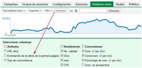 Al final de la entrada anterior puse como deberes buscar la pestaña donde se puede habilitar la columna "Estimación de la oferta de la primera página". Tengo la seguridad de que muchos la habrán encontrado, pero para quien no haya podido esta es la solución: haciendo clic en el botón "Columnas" de la pestaña "Palabras clave" podemos ver la oferta mínima para mostrar nuestro anuncio en la primera página de los resultados de búsqueda: